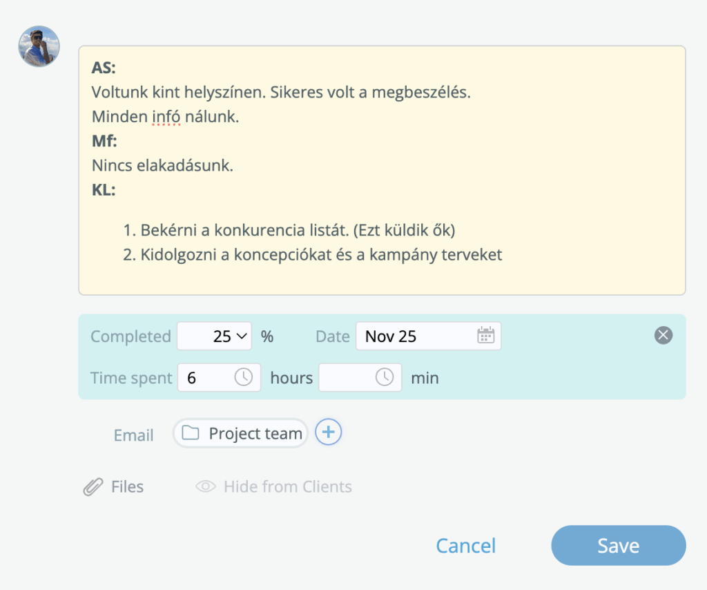 Ez mutatja meg, hogy ki min dolgozik, hol tartunk, mi hiányzik, és mi veszélyezteti a határidőt. Ha nincs státusz, akkor csak találgatunk — és a találgatás a legdrágább ügynökségi műfaj. Mindenki ideges lesz információ hiányos állapotban és a drága időnket azzal kell tölteni, hogy kutakodunk és csesztetjük egymást, hogy most akkor mi van a projekttel?