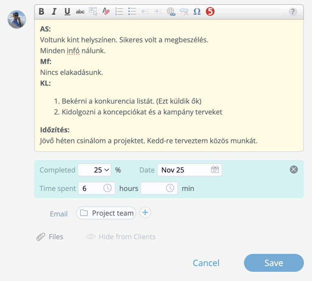 Státuszolni csak feladatra tudsz, projektre nem, mert csak feladathoz tudsz hozzáadni időt és %-ot! Tehát ezzel tudod jelölni, hogy haladtál az adott feladattal!